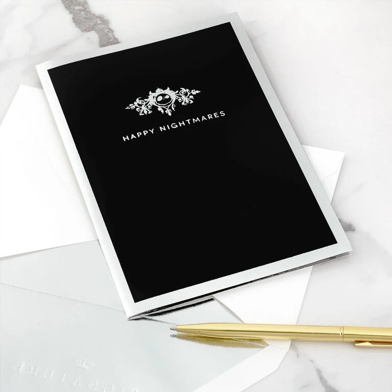 Pop-up greeting card cover features a Pumpkin King flourish design, “Happy Nightmares” message and a shiny silver foil border. Simply open the card to reveal the 3D pop-up surprise inside—no assembly required: an intricate, laser-cut “The Nightmare Before Christmas” scene pops out with Jack Skellington highlighted against a die-cut moon while Zero, Sally, Oogie Boogie and other favorite characters gather around the base. Shimmering silver foil accents adds spooktacular style. This exquisitely detailed card crafted from premium card stock is a work of art sure to be displayed all year long, making it an unforgettable choice for any fan of “The Nightmare Before Christmas” on their birthday, Halloween, Christmas or any other special occasion. When open, this pop-up card lays flat for display; 3D pop-up inside measures approx. 3.5″ H.