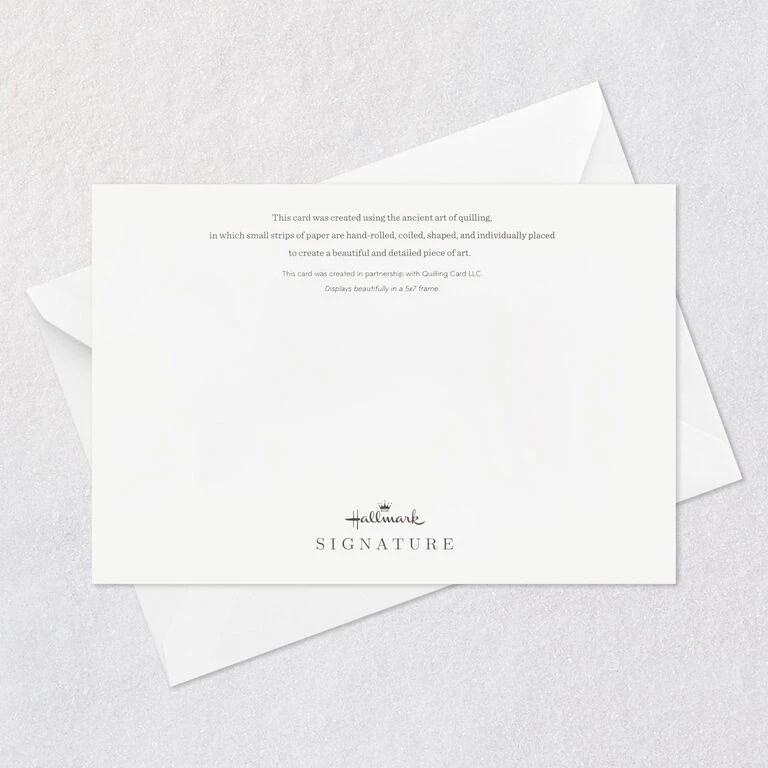 Birthday greeting card features a “Happy” message and colorful floral design made of intricate quilled paper. Greeting is a work of art that displays beautifully in a 5×7 frame (sold separately), making it an unforgettable way to share happy birthday wishes. Crafted using the ancient art of quilling, in which small strips of paper are hand-rolled, coiled, shaped and individually placed to create a beautiful and detailed piece of art, this Hallmark Signature card was designed in collaboration with Quilling Card LLC, a company seeking to promote the art of paper quilling.