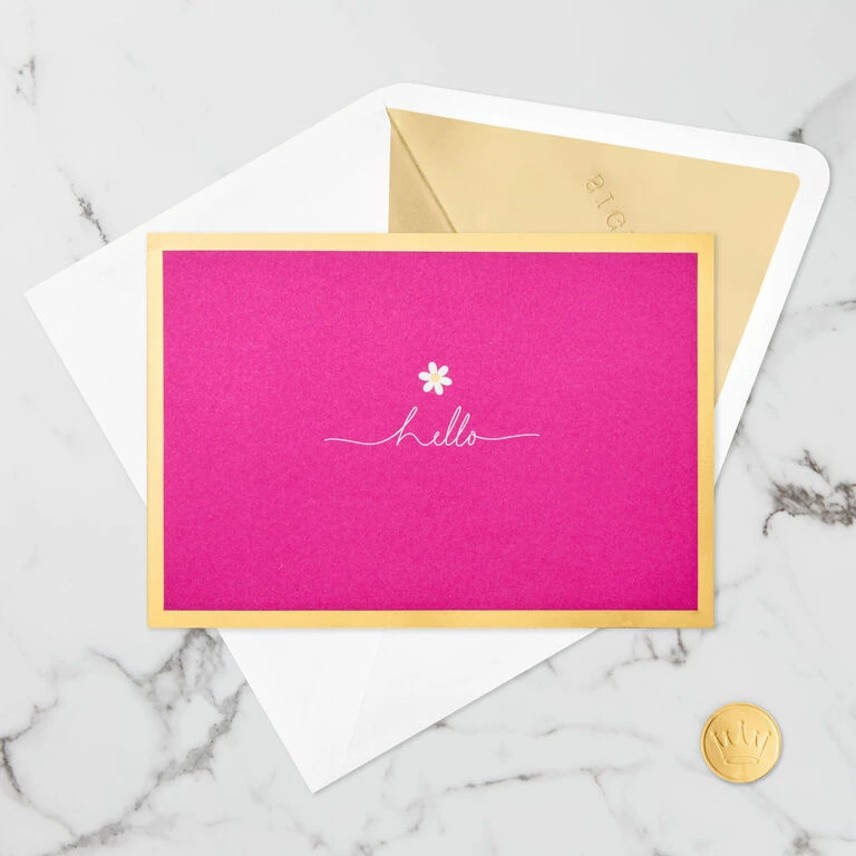 Pop-up thinking of you greeting card features a hot pink cover with flower icon, metallic gold foil border and “hello” message on the front. Simply open the card to reveal the 3D pop-up surprise inside—no assembly required: an intricate, laser-cut bouquet of pink and white flowers with sparkly glitter accents and shimmering gold foil pops out. This beautiful card crafted from premium card stock is a work of art sure to be displayed all year long, making it an unforgettable way to celebrate her birthday or Mother’s Day, share get well wishes or just to let a special friend or family member know she’s in your thoughts—today and always. When open, this pop-up card lays flat for display; 3D pop-up inside measures approx. 5.5″ H.