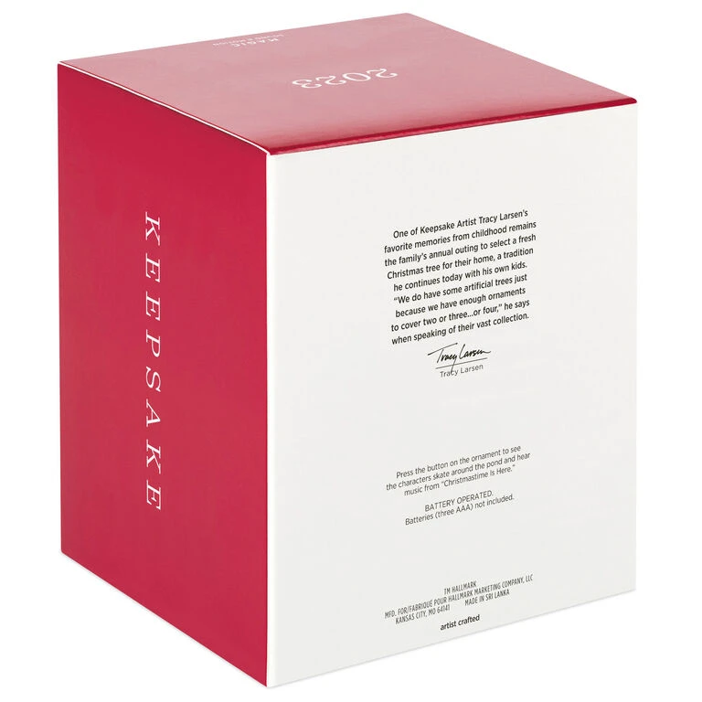 - Key Features: Press the button on the Magic Sound and Motion ornament to see the characters skate around the pond and hear music from “Christmastime Is Here.”
