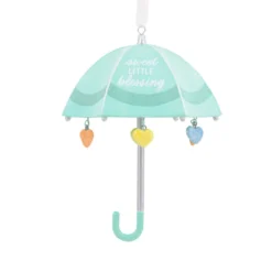 Remember a precious baby’s first Christmas for years to come. Parents and grandparents will love this premium porcelain Christmas tree ornament that features a sweet mint green umbrella with a sparkly scallop design and glittery heart charms.